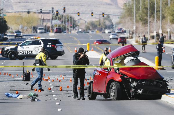 Authorities get set to tow a vehicle involved a six-car crash at the scene of a fatal crash on West Cheyenne Avenue in North Las Vegas Sunday Jan. Local time on Saturday a Dodge Challenger went speeding through a red light and crashed into multiple other vehicles at an intersection North Las Vegas Public Information. BOULDER CITY KLAS The southbound lanes of US.
